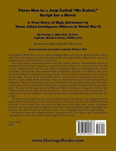 Do you want to make a movie? Here's how to do it. From Lawrence of Arabia to Charlie Wilson's War At the height of World War II, two U.S. military intelligence officers meet near the Khyber Pass with a British agent. Their secret mission: To travel from Peshawar for 800 miles along the Indian-Afghan border, and thus to introduce America to the Great Game of Central Asia. This movie script is a documentary, based on the book, Proceed to Peshawar. The Introduction tells of the evolution of this script from its beginning as a semi-fictional movie, Khyber Pass, to the true story of Three Men in a Jeep. The three men are sent with secret orders to travel from Peshawar, near the Khyber Pass, to Chitral and Quetta. Their trip takes them along the border of Afghanistan and India - now Pakistan. They are to learn how the British are keeping peace along the border. And with verbal, unwritten orders, they are to look for Soviet spies. This trip was the moment when the U.S. secretly entered the centuries-old contest known as the "Great Game" between Russia and Britain. They must learn about the ancient tribal customs, known as Pashtunwali. They must evade danger on mountain roads that are little more than donkey trails, with bandits on both sides, random crossfire by rifles and mortars, and bombs that drop "harmlessly, but with good moral effect." They pass into the distant land of the Mehtar of Chitral, and they go to villages such as Miram Shah in Waziristan that are now totally off limits to Americans. They are the first ever to cross the Lowari Pass in a motor vehicle. They visit Mingora in Swat, where the fourteen-year-old Nobel Prize winner, Malala, was shot in 2012. The Preface tells, in simple steps, how to use this book to make a movie from it. The Prologue tells of the people who have already helped to turn Proceed to Peshawar into a movie. You will read of Harvey Rochman, whose idea it was to make Khyber Pass, and of the help given by Ed Asner, Kevin Connor, and Howard Kazanjian. The story then moves to Hollywood, where advice is given by Jonathan Sanger, Galen Walker, and Jim Steele. But Khyber Pass was not made into a movie. It was a wonderful project, but it lacked funding. The plan for a movie then changed to become a documentary film, Three Men in a Jeep. It would still be a big project, but it could have a much smaller budget. Read it, and try it.