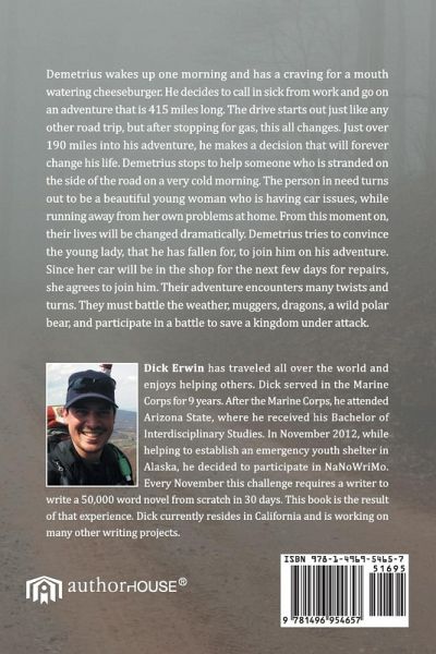 Demetrius wakes up one morning and has a craving for a mouth watering cheeseburger. He decides to call in sick from work and go on an adventure that is 415 miles long. The drive starts out just like any other road trip, but after stopping for gas, this all changes. Just over 190 miles into his adventure, he makes a decision that will forever change his life. Demetrius stops to help someone who is stranded on the side of the road on a very cold morning. The person in need turns out to be a beautiful young woman who is having car issues, while running away from her own problems at home. From this moment on, their lives will be changed dramatically. Demetrius tries to convince the young lady, that he has fallen for, to join him on his adventure. Since her car will be in the shop for the next few days for repairs, she agrees to join him. Their adventure encounters many twists and turns. They must battle the weather, muggers, dragons, a wild polar bear, and participate in a battle to save a kingdom under attack.