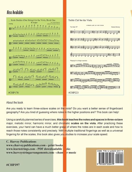 Are you ready to learn three-octave scales on the viola? Do you want a better sense of fingerboard geography? Are you tired of guessing where notes in the higher positions are? This book can help! Using a carefully planned series of exercises, this book teaches the notes and spaces in three-octave major, melodic minor, harmonic minor, and chromatic scales on the viola. After practicing these exercises, your hand can have a much better grasp of where the notes are in each scale and how to reach those notes consistently and precisely. With multiple traditional fingerings as well as a universal fingering for all the scales, this book also gives you studies to increase your scale speed.