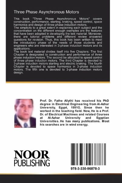 This book "Three Phase Asynchronous Motors" covers construction, performance, starting, braking, speed control, space harmonics and design of three phase induction motors. The simplicity to a great extent in explaining each subject and the concentration on the different enough examples are the features that have been adopted in developing the text material. Moreover, there are tutorial problems and different review answered questions for revision. Thus, this book has been written to meet the introductory phase of the needs of those students and engineers who are interested in 3-phase induction motors and its applications. The book text material divides itself into five Chapters: The first Chapter is designated to construction and performance of three phase induction motors. The second be allocated to speed control of three phase induction motors. The third Chapter is devoted to 3-phase induction motors starting and electric braking. The fourth Chapter is devoted to space harmonics in 3-phase induction motors. The fifth one is devoted to 3-phase induction motors design.