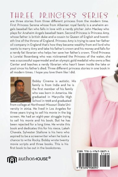 Three Princess Series are three stories from three different princess from the modern time. First Princess Serena whose from Albanian royal family is a anaheim angels baseball fan who falls in love with a nerdy pitcher John Mackey who plays for Anaheim Angels baseball team. Second Princess is Princess Amy, whose father is british duke and a cousin to Queen of English and twentieth line of the throne of England. Princess Amy is trying to save her father oil company in England that's how they became wealthy from evil lord who wants to marry Amy and take his father's crown and his money and falls for a nerdy fat librarian who helps her save her father's crown. Third Princess is Lorelai Rosenberg who was nicknamed the Princess of the water, she was a successful supermodel and an olympic gold medalist who owns a Rec Center and teaches a nerdy librarian who hasn't been inside the lake or pool since his father's died. Three different princess stories in one book in all modern times. I hope you love them like I did.