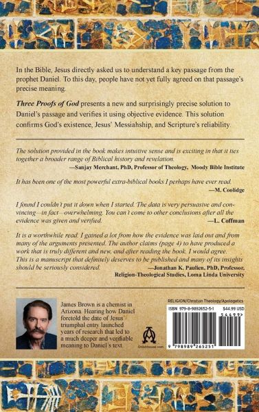 Three Proofs of God presents new, objective evidence of God's existence. It presents a new literal solution to Daniel 9:25. The solution provided in the book makes intuitive sense and is exciting in that it ties together a broader range of Biblical history and revelation. -Sanjay Merchant, PhD, Professor of Theology, Moody Bible Institute In the Bible, Jesus directly asked us to understand a key passage from the prophet Daniel. To this day, people have not yet fully agreed on that passage's precise meaning. Three Proofs of God presents a new and surprisingly precise solution to Daniel's passage and verifies it using objective evidence. This solution confirms God's existence, Jesus' Messiahship, and Scripture's reliability.
