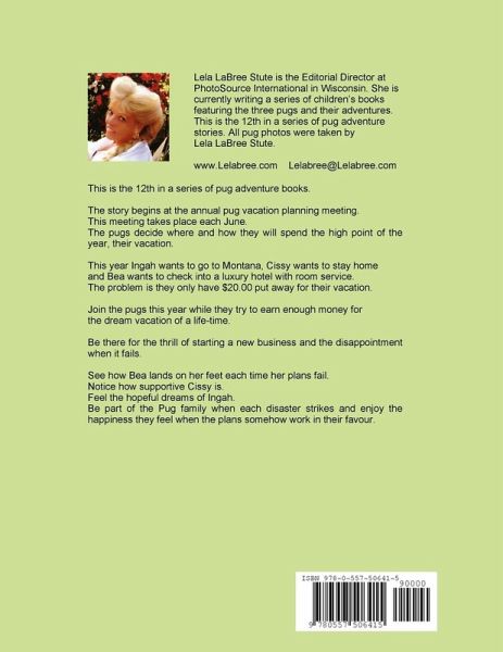 The story begins at the annual pug vacation planning meeting. This meeting takes place each June. The pugs decide where and how they will spend the high point of the year, their vacation. This year Ingah wants to go to Montana, Cissy wants to stay home and Bea wants to check into a luxury hotel with room service. The problem is they only have $20.00 put away for their vacation. Join the pugs this year while they try to earn enough money for the dream vacation of a life-time. Be there for the thrill of starting a new business and the disappointment when it fails. See how Bea lands on her feet each time her plans fail. Notice how supportive Cissy is. Feel the hopeful dreams of Ingah. Be part of the Pug family when each disaster strikes and enjoy the happiness they feel when the plans somehow work in their favour.