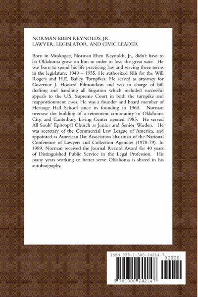 This is an autobiography written by former Oklahoma legislator Norman E. Reynolds, Jr., outlining his life from childhood days in Muskogee, Oklahoma, to college years at the University of Oklahoma, and war time overseas He spent three terms serving on the Oklahoma legislature, and later was one of the founders of Heritage Hall School, and oversaw the building of Canterbury Living Center for elderly care.