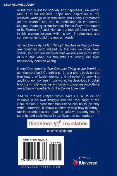 In his own quest for sobriety and happiness, AA author Mel B. found continual hope and inspiration in the classical writings of James Allen and Henry Drummond on the spiritual life, and in meditation on the deeper spiritual meaning of the famous Peace Prayer attributed to St. Francis of Assisi. He has reprinted all three of these in this present volume, with his own introductions and commentaries to aid the modern reader. James Allen's As a Man Thinketh teaches us that our lives are governed and shaped by the way we think, feel, speak, and act. We discover that we are always masters of our fate: when our thoughts are wrong, our lives necessarily become wrong. Henry Drummond's The Greatest Thing in the World, a commentary on I Corinthians 13, is a short book on the true nature of Love--eternal and all-powerful, surviving anything we now see in our world. He describes in detail how the simple ways we act towards ourselves and others are actually ingredients of the Divine Love itself. The St. Francis Prayer, which A.A.'s Bill W. found so valuable in his own struggle with the Dark Night of the Soul, makes it clear that true Peace can be found only within ourselves. It shows us step by step how to change our inner attitudes and goals to achieve the only kind of serenity and satisfaction in our lives that can endure.