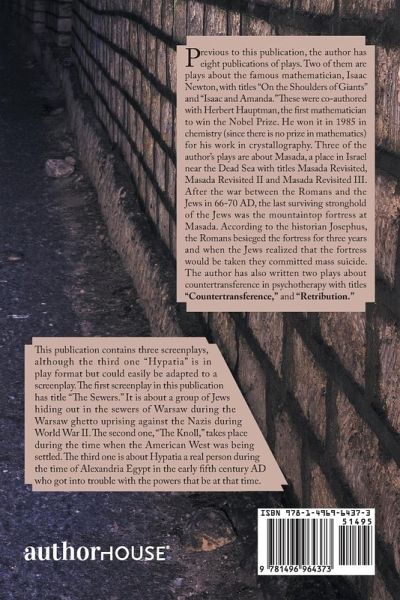 This publication contains three screenplays, although the third one "Hypatia" is in play format but could easily be adapted to a screenplay. The first screenplay in this publication has title "The Sewers." It is about a group of Jews hiding out in the sewers of Warsaw during the Warsaw ghetto uprising against the Nazis during World War II. The second one, "The Knoll," takes place during the time when the American West was being settled. The third one is about Hypatia a real person during the time of Alexandria Egypt in the early fifth century AD who got into trouble with the powers that be at that time.