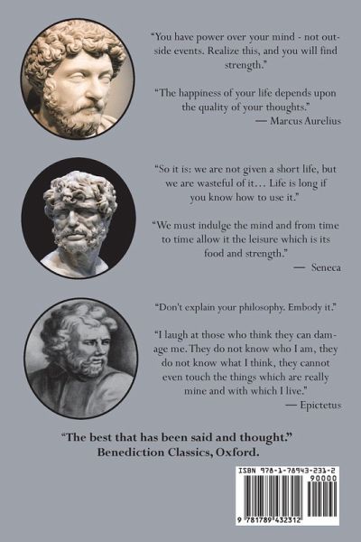 "The happiness of your life depends upon the quality of your thoughts." - Marcus Aurelius "You have power over your mind - not outside events. Realize this, and you will find strength." - Marcus Aurelius "So it is: we are not given a short life but we are wasteful of it... Life is long if you know how to use it.- Seneca "We must indulge the mind and from time to time allow it the leisure which is its food and strength." - Seneca "Don't explain your philosophy. Embody it." - Epictetus "First say to yourself what you would be; and then do what you have to do." - Epictetus Three Stoic Classics…mehr