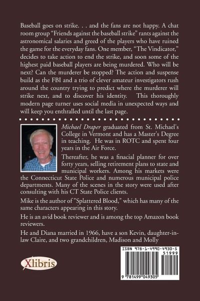 Baseball goes on strike. As following baseball is the main avocation of many people, there is a great deal of discontent. A chat group is formed, "Friends against the baseball strike." One member is a terrorist wannabe and he is able to manipulate a gullible man who has no life to obey his wishes. He tells the man, who takes on the name "The Vindicator," he should strike back against the sport. Baseball used to be the sport of the common man but now with the multimillion-dollar contracts, regular people can't afford the price of admission. It can cost hundreds of dollars for a man and wife to bring their children to a baseball game and get some food. The gullible man uses the name "The Vindicator" on the chat site. The other man uses the name "The Advocate." No one has paid much attention to him (The Vindicator) in the past so he wants to please The Advocate. He decides to take action and kill the highest paid player on each team. Each killing will be in a different way and there will be a message to "end the strike." After the first killing, the FBI becomes involved and the Baseball Commissioner's Office hires a group of private investigators to show they are proactive. This group consists of a young woman and two men who are in training by a retired state trooper. As more ball players are killed, the trio of private investigators decides to challenge the killer using social media. They put a notice on Facebook to see if they can get the killer to go after one of them, who will be armed. The private investigators are working with the FBI and able to get video surveillance tape from the hotel where the first killing took place. Together with tape from an airport car rental, there is enough for facial recognition but it's hazy. The photo is placed in the newspapers and the private investigators get a lead. There is a major confrontation at the Union Station in Washington. This is between the killer, the man who manipulated him, a man with a bomb, and the FBI and private investigators.