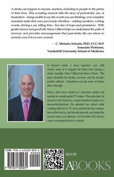 A lawyer's mind and a news reporter's way with words-none of it stopped Harry Gilbert's brain from having a stroke. Actually, he had three of them. This story chronicles his strokes, recovery, and (mostly) positive attitude. A stroke can happen to anyone, anytime, including to people in the prime of their lives. This revealing memoir tells the story of post-stroke: of the frustration of being unable to say the words you are thinking, or to complete mundane tasks that were previously effortless, like adding simple numbers, writing, telling time or driving a car-but also of hope and persistence. With gentle humor, author Harry Gilbert helps us understand the path of recovery and provides encouragement that post-stroke life can return to normal-even if it is a new normal.