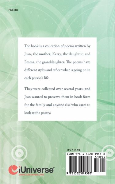 The book is a collection of poems written by Jean, the mother; Kerry, the daughter; and Emma, the granddaughter. The poems have different styles and reflect what is going on in each persons life. They were collected over several years, and Jean wanted to preserve them in book form for the family and anyone else who cares to look at the poetry.
