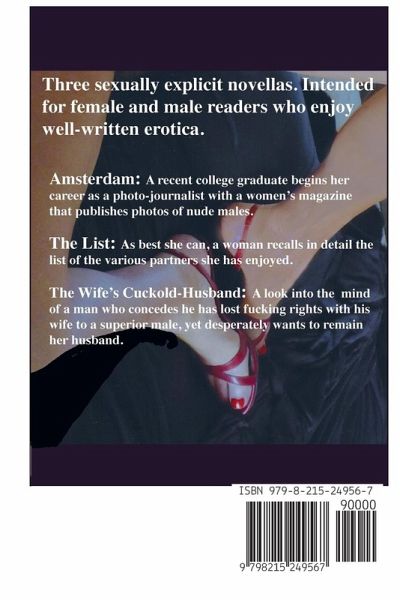 Three short sexually explicit erotic novels. Amsterdam: Fresh out of college, a woman begins her career as a photo journalist with a magazine that features nude male models, beginning her exploration of the world of handsome, well-hung men with great physiques. The List: A woman reminisces about the various partners she has known. The Wife's Cuckold-Husband: A loving husband comes to terms with the fact that he has lost fucking rights with his wife to a superior male yet desperately wants to remain her husband.