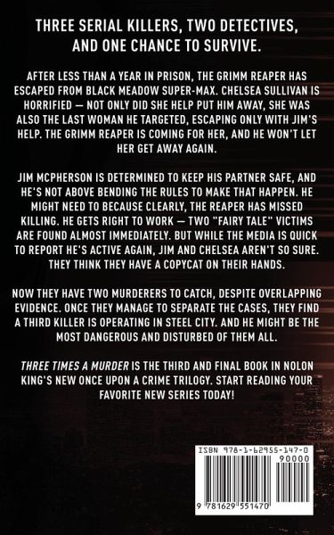 Three serial killers, two detectives, and one chance to survive. After less than a year in prison, the Grimm Reaper has escaped from Black Meadow super-max. Chelsea Sullivan is horrified - not only did she help put him away, she was also the last woman he targeted, escaping only with Jim's help. The Grimm Reaper is coming for her, and he won't let her get away again. Jim McPherson is determined to keep his partner safe, and he's not above bending the rules to make that happen. He might need to because clearly, the Reaper has missed killing. He gets right to work - two "fairy tale" victims are found almost immediately. But while the media is quick to report he's active again, Jim and Chelsea aren't so sure. They think they have a copycat on their hands. Now they have two murderers to catch, despite overlapping evidence. Once they manage to separate the cases, they find a third killer is operating in Steel City. And he might be the most dangerous and disturbed of them all. Three Times A Murder is the third and final book in Nolon King's new Once Upon A Crime Trilogy. Start reading your favorite new series today!