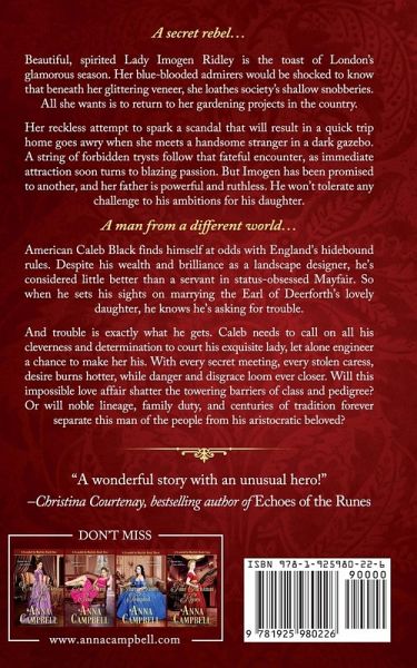 A secret rebel... Beautiful, spirited Lady Imogen Ridley is the toast of London's glamorous season. Her blue-blooded admirers would be shocked to know that beneath her glittering veneer, she loathes society's shallow snobberies. All she wants is to return to her gardening projects in the country. Her reckless attempt to spark a scandal that will result in a quick trip home goes awry when she meets a handsome stranger in a dark gazebo. A string of forbidden trysts follow that fateful encounter, as immediate attraction soon turns to blazing passion. But Imogen has been promised to another, and her father is powerful and ruthless. He won't tolerate any challenge to his ambitions for his daughter. A man from a different world... American Caleb Black finds himself at odds with England's hidebound rules. Despite his wealth and brilliance as a landscape designer, he's considered little better than a servant in status-obsessed Mayfair. So when he sets his sights on marrying the Earl of Deerforth's lovely daughter, he knows he's asking for trouble. And trouble is exactly what he gets. Caleb needs to call on all his cleverness and determination to court his exquisite lady, let alone engineer a chance to make her his. With every secret meeting, every stolen caress, desire burns hotter, while danger and disgrace loom ever closer. Will this impossible love affair shatter the towering barriers of class and pedigree? Or will noble lineage, family duty, and centuries of tradition forever separate this man of the people from his aristocratic beloved?