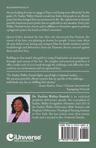 Are you looking for ways to engage in Prayer and fasting more effectively? In this guide, Dr. Pauline Walley-Daniels reveals how Esther led people in an effective prayer fast that changed their circumstances for life. She explains how to fast and provides important prayer points that are applicable to any situation. Every year, Walley-Daniels's home church and its affiliates set themselves apart to perform a progressive prayer fast based on Esther's encounter. Queen Esther declared the fast when she discovered that Haman, the enemy of the Jews, was plotting to destroy her people. It was a time when all came before God, fasting and crying to Him for family members and for breakthrough and deliverance from any Hamanic decrees enacted against them and their lives. Building on that model, this guide is a song of inspiration, an encouragement through each season of the fast. The insights and practical guidelines it offers enable each of us to break through the challenges and difficulties that confront our environment and our spiritual lives. "Dr. Pauline Walley-Daniels fights a good fight of spiritual warfare. ... She presents powerful, effective prayers that are specific to the challenges individuals may face in fulfilling their destiny." -Susan Slusher, Dean, Christian International Equipping Network
