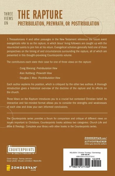 The rapture--or the belief that Jesus' living followers will, at some point, join him forever while others do not--is an important but contested doctrine among evangelicals. Scholars generally hold one of three perspectives on the timing and circumstances of the rapture, all of which are presented in this important volume of the Counterpoints series, Three Views on the Rapture: Alan D. Hultberg (PhD, Trinity International University and professor of New Testament at Talbot School of Theology) explains the Pre-Wrath view. Craig Blaising (PhD, Dallas Theological Seminary and president of Southwestern Baptist Theological Seminary) defends the Pre-Tribulation view. Douglas Moo (PhD, University of St. Andrews and professor of New Testament at Wheaton College) sets forth the Post-Tribulation view. Each author provides a substantive explanation of his position, which is critiqued by the other two authors. A thorough introduction gives a historical overview of the doctrine of the rapture and its effects on the church. The interactive and fair-minded format of the Counterpoints series allows readers to consider the strengths and weaknesses of each view and draw informed, personal conclusions.