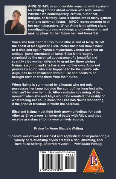 Since she took her first trip to the little island of Nosy Bé off the coast of Madagascar, Elise Porter has been drawn back to it time and again. When a mysterious vendor sells her an antique, jewel-encrusted oil lamp, Elise is thoroughly surprised by the mystical appearance of a beautiful and scantily clad woman offering to grant her three wishes. Naima is a Jinni, and she has a wish of her own. A cursed princess's spirit, who also happens to be the Jinni's wife Aliya, has taken residence within Elise and needs to be brought forth to free them from their curse. When Naima is summoned by a human who not only possesses her lamp but also the spirit of her long-lost wife, she can't believe her luck. After centuries dreaming of the moment when she and Aliya would be reunited, the reality of what freeing her could mean for Elise has Naima wondering if the price of freedom is worth the sacrifice. Elise and Naima must fight their growing feelings for each other as Elise wages an internal battle with Aliya, and they receive assistance from a very unlikely source.