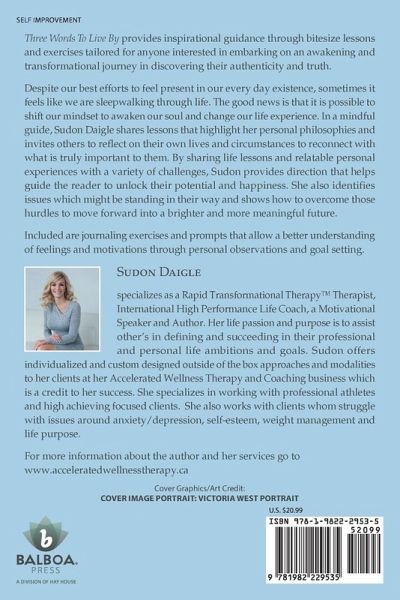 Three Words To Live By provides inspirational guidance through bitesize lessons and exercises tailored for anyone interested in embarking on an awakening and transformational journey in discovering their authenticity and truth. Despite our best efforts to feel present in our every day existence, sometimes it feels like we are sleepwalking through life. The good news is that it is possible to shift our mindset to awaken our soul and change our life experience. In a mindful guide, Sudon Daigle shares lessons that highlight her personal philosophies and invites others to reflect on their own lives and circumstances to reconnect with what is truly important to them. By sharing life lessons and relatable personal experiences with a variety of challenges, Sudon provides direction that helps guide the reader to unlock their potential and happiness. She also identifies issues which might be standing in their way and shows how to overcome those hurdles to move forward into a brighter and more meaningful future. Included are journaling exercises and prompts that allow a better understanding of feelings and motivations through personal observations and goal setting.