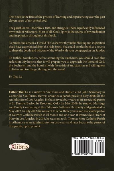 This book is a fruit of a process of learning and experiencing of my pastoral ministries throughout the past eleven years of my priesthood. The parishioners- their lives, faith, and struggles-have significantly influenced my words of reflections. Most of all, God's Spirit is the source of my meditation and inspiration throughout this book. To priests and deacons, with these humble and simple words of reflections in this book, I like to share with you the blessing and inspiration that I have experienced from the Holy Spirit. You could use this book as source ideas to inspire so to share with your congregation the depth and wisdom of the Word on Sunday. To faithful worshipers, before attending the Eucharist, you should read this reflection. My hope is it will prepare you to approach the Word of God, the Eucharist, and the homilist with the spirit of anticipation and willingness to listen and to change throughout the week! Fr. Thai Le