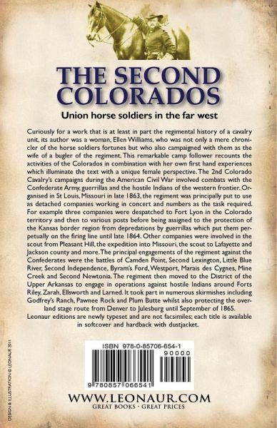 Union horse soldiers in the far west Curiously for a work that is at least in part the regimental history of a cavalry unit, its author was a woman, Ellen Williams, who was not only a mere chronicler of the horse soldiers fortunes but who also campaigned with them as the wife of a bugler of the regiment. This remarkable camp follower recounts the activities of the Colorados in combination with her own first hand experiences which illuminate the text with a unique female perspective. The 2nd Colorado Cavalry's campaigns during the American Civil War involved combats with the Confederate Army, guerrillas and the hostile Indians of the western frontier. Organised in St Louis, Missouri in late 1863, the regiment was principally put to use as detached companies working in concert and numbers as the task required. For example three companies were despatched to Fort Lyon in the Colorado territory and then to various posts before being assigned to the protection of the Kansas border region from depredations by guerrillas which put them perpetually on the firing line until late 1864. Other companies were involved in the scout from Pleasant Hill, the expedition into Missouri, the scout to Lafayette and Jackson county and more. The principal engagements of the regiment against the Confederates were the battles of Camden Point, Second Lexington, Little Blue River, Second Independence, Byram's Ford, Westport, Marais des Cygnes, Mine Creek and Second Newtonia. The regiment then moved to the District of the Upper Arkansas to engage in operations against hostile Indians around Forts Riley, Zarah, Ellsworth and Larned. It took part in numerous skirmishes including Godfrey's Ranch, Pawnee Rock and Plum Butte whilst also protecting the overland stage route from Denver to Julesburg until September of 1865. Leonaur editions are newly typeset and are not facsimiles; each title is available in softcover and hardback with dustjacket.