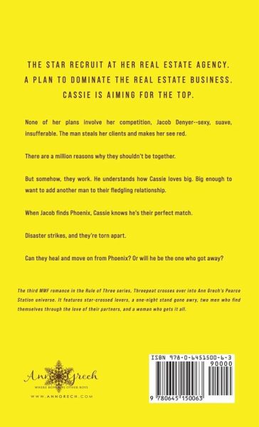 The star recruit at her real estate agency. A plan to dominate the real estate business. Cassie is aiming for the top. None of her plans involve her competition, Jacob Denyer--sexy, suave, insufferable. The man steals her clients and makes her see red. There are a million reasons why they shouldn't be together. But somehow, they work. He understands how Cassie loves big. Big enough to want to add another man to their fledgling relationship. When Jacob finds Phoenix, Cassie knows he's their perfect match. Disaster strikes, and they're torn apart. Can they heal and move on from Phoenix? Or will he be the one who got away? The third MMF romance in the Rule of Three series, Threepeat crosses over into Ann Grech's Pearce Station universe. It features star-crossed lovers, a one-night stand gone awry, two men who find themselves through the love of their partners, and a woman who gets it all.