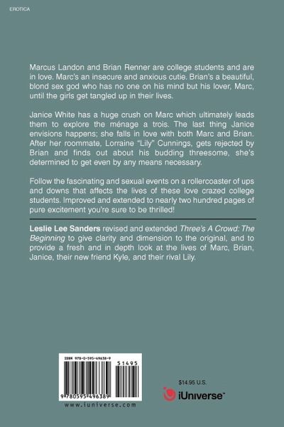 Marcus Landon and Brian Renner are college students and are in love. Marc's an insecure and anxious cutie. Brian's a beautiful, blond sex god who has no one on his mind but his lover, Marc, until the girls get tangled up in their lives. Janice White has a huge crush on Marc which ultimately leads them to explore the ménage a trois. The last thing Janice envisions happens; she falls in love with both Marc and Brian. After her roommate, Lorraine "Lily" Cunnings, gets rejected by Brian and finds out about his budding threesome, she's determined to get even by any means necessary. Follow the fascinating and sexual events on a rollercoaster of ups and downs that affects the lives of these love crazed college students. Improved and extended to nearly two hundred pages of pure excitement you're sure to be thrilled!