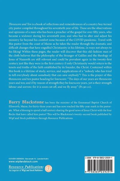Threescore and Ten is a book of reflections and remembrances of a country boy turned city pastor compiled throughout his seventieth year of life. These are the observations and opinions of a man who has been a preacher of the gospel for over fifty years, who became a widower during his seventieth year, and who had to alter and adjust his ministry far beyond his comfort zone because of the COVID pandemic. Travel with this pastor from the coast of Maine as he takes the reader through the dramatic and difficult changes that have engulfed Christianity in his lifetime, in ways not always to his liking! Within these pages, the reader will discover that this old-fashion man of the cloth believes that the philosophy of the Stranger of Galilee and the theology of Jesus of Nazareth are still relevant and could be prevalent again in the twenty-first century just like they were in the first century if only Christianity would return to the tenets and truths of the faith established by its founder, the Christ. Contained within this book is a lifetime of study, service, and supplications of a ""nobody who has tried to tell everybody about somebody that can save anybody""! This is the prayer of this threescore and ten pastor heading for fourscore: ""The days of our years are threescore years and ten; and if by reason of strength they be fourscore years, yet is their strength labour and sorrow; for it is soon cut off, and we fly away"" (Ps 90:10).