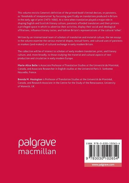 This volume revisits Genette's definition of the printed book's liminal devices, or paratexts, as 'thresholds of interpretation' by focussing specifically on translations produced in Britain in the early age of print (1473-1660). At a time when translation played a major role in shaping English and Scottish literary culture, paratexts afforded translators and their printers a privileged space in which to advertise their activities, display their social and ideological affiliations, influence literary tastes, and fashion Britain's representations of the cultural 'other'. Written by an international team of scholars of translation and material culture, the ten essays in the volume examine the various material shapes, textual forms, and cultural uses of paratexts as markers (and makers) of cultural exchange in early modern Britain. The collection will be of interest to scholars of early modern translation, print, and literary culture, and, more broadly, to those studying the material and cultural aspects of text production and circulation in early modern Europe.