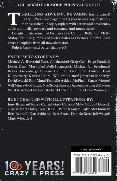 You asked for more pulp? You got it! THRILLING ADVENTURE YARNS has returned! Crazy 8 Press once again treats you to an array of stories in the classic pulp style, replete with action and adventure, chills and thrills, mystery and romance, and much more! Delight in the return of favorites like Cannon Belle and Molly Maloy! Exult in glimpses of such classics as Sherlock Holmes! And cheer at exploits from all-new characters! Pulp is back-and better than ever! Enthuse to stories by: Michael A. Burstein! Russ Colchamiro! Greg Cox! Paige Daniels! Lester Dent! Mary Fan! Kelli Fitzpatrick! Michael Jan Friedman! Robert Greenberger! Glenn Hauman! Heather E. Hutsell! Paul Kupperberg! Karissa Laurel! William Leisner! Jonathan Maberry! David Mack! Ron Marz! Danielle Ackley-McPhail! Stuart Moore! Will Murray! Jody Lynn Nye! Scott Pearson! Aaron Rosenberg! Dayton Ward & Kevin Dilmore! Richard C. White! Sherri Cook Woosley! Be Enchanted with illustrations by: June Brigman! Kerry Callen! Gary Carbon! Mike Collins! Daerick Gross! Matt Haley! Karl Kesel! Peter Krause! Luke McDonnell! Ron Randall! Dan Schkade! Bart Sears! Daniele Sera! Jeff Weigel! Mark Wheatley!