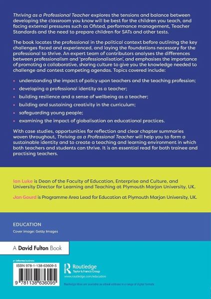 Thriving as a Professional Teacher explores the tensions and balance between developing the classroom you know will be best for the children you teach, and facing external pressures such as Ofsted, performance management, Teacher Standards and the need to prepare children for SATs and other tests. The book locates the professional in the political context before outlining the key challenges faced and experienced, and laying the foundations necessary for the professional to thrive. An expert team of contributors analyses the differences between professionalism and 'professionalisation', and emphasises the importance of promoting a collaborative, sharing culture to give you the knowledge needed to challenge and contest competing agendas. Topics covered include: understanding the impact of policy upon teachers and the teaching profession; developing a professional identity as a teacher; building resilience and a sense of wellbeing as a teacher; building and sustaining creativity in the curriculum; safeguarding young people; examining the impact of globalisation on educational practices. With case studies, opportunities for reflection and clear chapter summaries woven throughout, Thriving as a Professional Teacher will help you to form a sustainable identity and to create a teaching and learning environment in which both teachers and students can thrive. It is an essential read for both trainee and practising teachers.