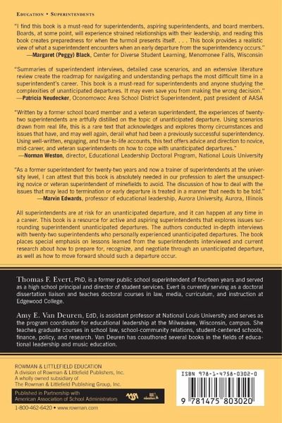 Thriving as a Superintendent: How to Recognize and Survive an Unanticipated Departure is a resource for active and aspiring superintendents, which explores issues surrounding superintendent unanticipated departures. The book places special emphasis on lessons learned from the superintendents interviewed and current research about how to prepare for, recognize, and negotiate through an unanticipated departure, as well as how to move forward should such a departure occur.