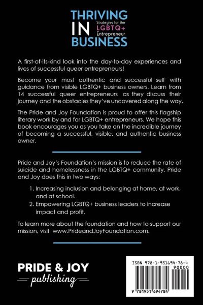 A first-of-its-kind look into the day-to-day experiences and lives of successful queer entrepreneurs! Become your most authentic and successful self with guidance from visible LGBTQ+ business owners. Learn from 14 successful queer entrepreneurs as they discuss their journey and the obstacles they've uncovered on the way. The Pride and Joy Foundation is proud to offer this flagship literary work by and for LGBTQ+ entrepreneurs. We hope this book encourages you as you take on the incredible journey of becoming a successful, visible, and authentic business owner.