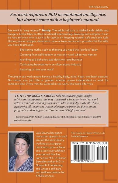Sex work is "easy money?" Hardly. The adult industry is riddled with pitfalls and dangers. Erotic labor is often emotionally demanding, draining, and complex. It can be hard to know who to turn to for advice on keeping yourself safe and sane. Lola Davina, former stripper, dominatrix, porn actress and escort, provides the life skills you need to prosper: · Shattering myths, such as thinking you need the "perfect" body · Creating financial freedom so you only work when you want to · Avoiding bad behavior, bad decisions, and burnout · Cultivating boundaries in an often insane industry · Learning to love your work! Thriving in sex work means having a healthy body, mind, heart, and bank account. No matter your job title or gender, whether you’re independent or work for someone else, if you want to succeed in sex work, this book is for you.