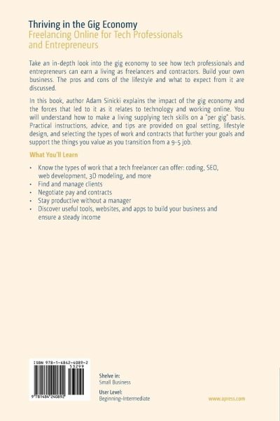 In this book, author Adam Sinicki explains the impact of the gig economy and the forces that led to it as it relates to technology and working online. You will understand how to make a living supplying tech skills on a "per gig" basis. Practical instructions, advice, and tips are provided on goal setting, lifestyle design, and selecting the types of work and contracts that further your goals and support the things you value as you transition from a 9-5 job.