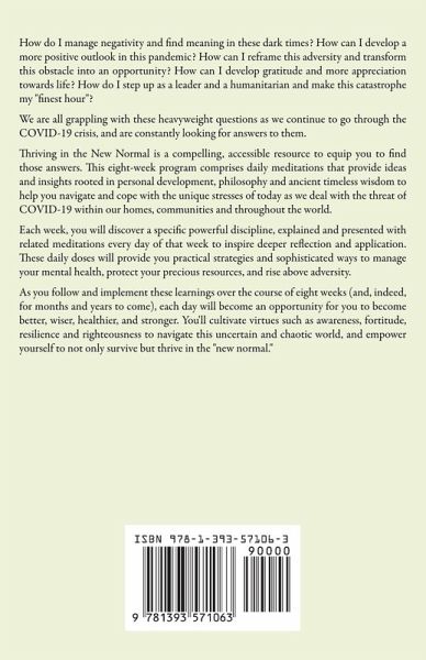 How do I manage negativity and find meaning in these dark times? How can I develop a more positive outlook in this pandemic? How can I reframe this adversity and transform this obstacle into an opportunity? How can I develop gratitude and more appreciation towards life? How do I step up as a leader and a humanitarian and make this catastrophe my "finest hour"? We are all grappling with these heavyweight questions as we continue to go through the COVID-19 crisis, and are constantly looking for answers to them. Thriving in the New Normal is a compelling, accessible resource to equip you to find those answers. This eight-week program comprises daily meditations that provide ideas and insights rooted in personal development, philosophy and ancient timeless wisdom to help you navigate and cope with the unique stresses of today as we deal with the threat of COVID-19 within our homes, communities and throughout the world. Each week, you will discover a specific powerful discipline, explained and presented with related meditations every day of that week to inspire deeper reflection and application. These daily doses will provide you practical strategies and sophisticated ways to manage your mental health, protect your precious resources, and rise above adversity. As you follow and implement these learnings over the course of eight weeks (and, indeed, for months and years to come), each day will become an opportunity for you to become better, wiser, healthier, and stronger. You'll cultivate virtues such as awareness, fortitude, resilience and righteousness to navigate this uncertain and chaotic world, and empower yourself to not only survive but thrive in the "new normal."