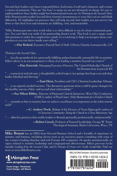 Second chair leaders play a critical role in churches across the world. They serve in paid and unpaid capacities, and include laity, ordained clergy, bivocational, licensed local pastors and others who lead significant ministries, but who are not the lead or senior pastor. Mike Bonem, author of Leading from the Second Chair, takes that important work to the next level, with Thriving in the Second Chair. Here, Bonem points readers beyond their external circumstances to the ways they can act and think differently. He highlights ten key factors that will help second chair leaders do more than just survive. These deep "springs" will enable them to thrive, so that their lives and ministries are fulfilling, vital, and sustainable. The first three springs relate to the single most important professional relationship for any second chair leader - their relationship with the first chair. The next four look at some of the most common and essential aspects of the second chair's job. The final three springs are arguably the deepest and most important. They enable second chairs to thrive even if they're struggling with the first seven. These three springs offer help for staying spiritually anchored, overcoming loneliness, and becoming re-energized.
