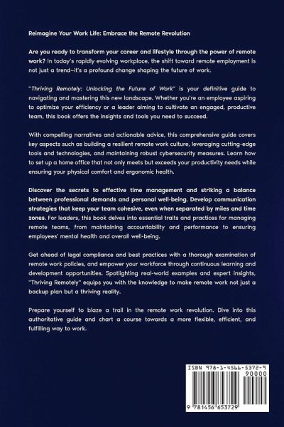 Reimagine Your Work Life: Embrace the Remote Revolution Are you ready to transform your career and lifestyle through the power of remote work? In today's rapidly evolving workplace, the shift toward remote employment is not just a trend-it's a profound change shaping the future of work. "Thriving Remotely: Unlocking the Future of Work" is your definitive guide to navigating and mastering this new landscape. Whether you're an employee aspiring to optimize your efficiency or a leader aiming to cultivate an engaged, productive team, this book offers the insights and tools you need to succeed. With compelling narratives and actionable advice, this comprehensive guide covers key aspects such as building a resilient remote work culture, leveraging cutting-edge tools and technologies, and maintaining robust cybersecurity measures. Learn how to set up a home office that not only meets but exceeds your productivity needs while ensuring your physical comfort and ergonomic health. Discover the secrets to effective time management and striking a balance between professional demands and personal well-being. Develop communication strategies that keep your team cohesive, even when separated by miles and time zones. For leaders, this book delves into essential traits and practices for managing remote teams, from maintaining accountability and performance to ensuring employees' mental health and overall well-being. Get ahead of legal compliance and best practices with a thorough examination of remote work policies, and empower your workforce through continuous learning and development opportunities. Spotlighting real-world examples and expert insights, "Thriving Remotely" equips you with the knowledge to make remote work not just a backup plan but a thriving reality. Prepare yourself to blaze a trail in the remote work revolution. Dive into this authoritative guide and chart a course towards a more flexible, efficient, and fulfilling way to work.