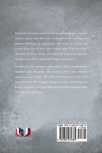Kestrel lives to inspire others, but has her own mysterious past that remains a ghost story. She is the co-founder of Thriving Through Seasons Ministries, an organization that heals the broken and teaches them how to heal other broken souls. With her fellow characters (Andreya, Andra, and Eijaz), she finds peace and love through Jesus Christ, despite their tragic circumstances. Join Kestrel as she experiences suffering, loss, illness, abandonment, tragedies, and deception. Her journey delves into relatable experiences and battles. The story and characters in this book represent many life struggles, facing your past, and finding the hope to overcome it. Perhaps others may find hope and peace from "Thriving Through Seasons."