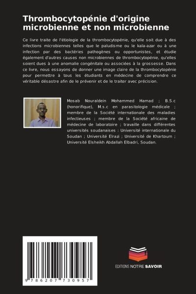 Ce livre traite de l'étiologie de la thrombocytopénie, qu'elle soit due à des infections microbiennes telles que le paludisme ou le kala-azar ou à une infection par des bactéries pathogènes ou opportunistes, et étudie également d'autres causes non microbiennes de thrombocytopénie, qu'elles soient dues à une anomalie congénitale ou associées à la grossesse. Dans ce livre, nous essayons de donner une image claire de la thrombocytopénie pour permettre à tous les étudiants en médecine de comprendre ce véritable désastre afin de le prévenir et de le traiter avec précision.