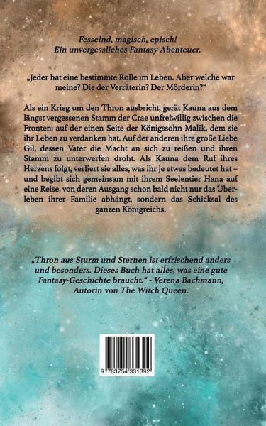 "Jeder hat eine bestimmte Rolle im Leben. Aber welche war meine? Die der Verräterin? Der Mörderin?"Als ein Krieg um den Thron des Königreichs Tara'Unn ausbricht, gerät Kauna aus dem längst vergessenen Stamm der Crae zwischen die Fronten: auf der einen Seite der Königssohn Malik, dem sie ihr Leben zu verdanken hat. Auf der anderen Seite ihre große Liebe Gil, dessen Vater die Macht an sich zu reißen und ihren Stamm zu unterwerfen droht. Mit ihrer Entscheidung verliert sie alles, was ihr je etwas bedeutet hat - und begibt sich mit ihrem besten Freund Deema und ihrem Seelentier Hana auf eine Reise, von deren Ausgang schon bald nicht nur das Überleben ihrer Familie abhängt, sondern das Schicksal des ganzen Königreichs.///"Seelendonner" ist der Auftakt der abgeschlossenen orientalischen High-Fantasy-Dilogie rund um eine starke Protagonistin, ein frühmodernes nahöstliches Setting, Seelentiere als magische Begleiter und einen Krieg, der beinahe aussichtslos erscheint.///"'Thron aus Sturmund Sternen' ist erfrischend anders und besonders. Dieses Buch hat alles, was eine gute Fantasy-Geschichte braucht. Lebhafter Schreibstil, authentische Charaktere, ein kreatives Setting. Dazu Spannung, Überraschungen, Dramatik, Verrat und ein Hauch Magie. Mit 'Seelendonner' ist Annie Waye ein bemerkenswerter Debütroman gelungen."- Verena Bachmann, Autorin von "The Witch Queen".