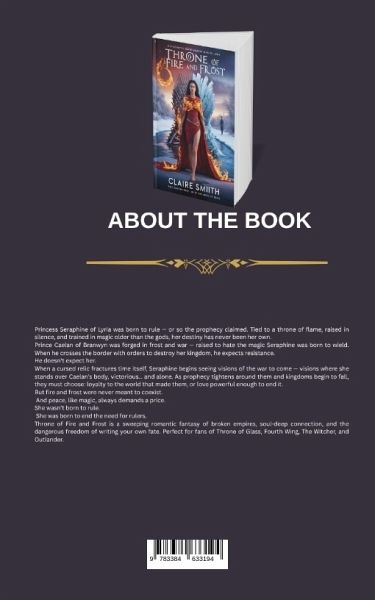 In a world divided by magic and war, a flamebound princess and a frostborn prince must choose between love and loyalty when a cursed relic fractures time itself. Torn between duty, destiny, and the terrifying glimpses of a future they cannot escape, they must fight not just for their kingdoms-but for the right to choose their own fate.Throne of Fire and Frost is an epic romantic fantasy of shattered prophecy, forbidden love, and the end of rulers who never should have reigned. Perfect for fans of Throne of Glass, Fourth Wing, and Outlander.Two thrones. Two hearts. One future destined to burn.