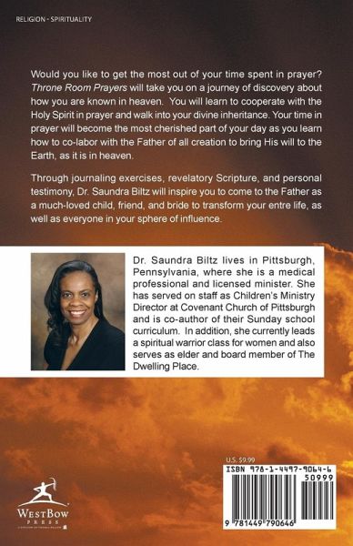 Would you like to get the most out of your time spent in prayer? Throne Room Prayers will take you on a journey of discovery about how you are known in heaven. You will learn to cooperate with the Holy Spirit in prayer and walk into your divine inheritance. Your time in prayer will become the most cherished part of your day as you learn how to co-labor with the Father of all creation to bring His will to the Earth, as it is in heaven. Through journaling exercises, revelatory Scripture, and personal testimony, Dr. Saundra Biltz will inspire you to come to the Father as a much-loved child, friend, and bride to transform your entre life, as well as everyone in your sphere of influence.