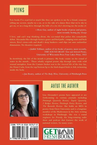The poems in Lisa Alexander's debut collection, throttlebody, operate like the mechanism that gives the collection its name -- they navigate the tension of an idling engine and the wildness of a wide-open throttle. Her steady-eyed speaker allows the reader to leap from the tangible to the intangible as she explores the risks and celebrations of experimentation. Alexander writes, "My body counts on the sound of water / in the mouth, the brush of lips / grazing the phone receiver / to be reminded that it is more echo than matter." This collection does not shy away from illuminating the speaker's vulnerable and imperfect investigations. Rather, throttlebody looks head-on at an uncertain world and leaves room for it to expose its own faults as well as its redemptions.