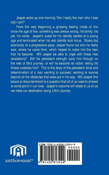 Jasper woke up one morning "Am I really the man who I was told I was?" From the very beginning a gnawing feeling inside of him since the age of five, something was always wrong, his family, his job, his name. Jasper's quest for his identity started at a young age and terminated when his real identity took focus. Slowly but eventually at a progressive pace, Jasper found out who he really was, where he came from, which helped to make him the man that he became. Will Jasper be able to cope with these new revelations? Will his persistent strength carry him through on the rest of life's journey, or will he become its victim, letting his illness overtake him? This is the story of the persistent drive and determination of a man wanting to succeed, wanting to survive beyond all the obstacles that were put in his way. Will Jasper find peace or discontentment is a question that all of us need to answer at some point in our lives. Jasper's outcome will relate to us all as we meet our destination along Life's Journey.