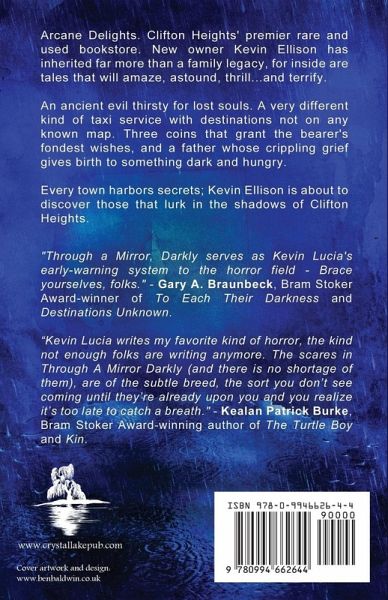 What if a book delves into the lives of the very town you live in? Reveals to you some personal stories of people you know? Or thought you knew. Arcane Delights. Clifton Heights' premier rare and used bookstore. In it, new owner Kevin Ellison has inherited far more than a family legacy, for inside are tales that will amaze, astound, thrill...and terrify. An ancient evil thirsty for lost souls. A very different kind of taxi service with destinations not on any known map. Three coins that grant the bearer's fondest wish, and a father whose crippling grief gives birth to something dark and hungry. Every town harbors secrets. Kevin Ellison is about to discover those that lurk in the shadows of Clifton Heights. "Kevin Lucia writes my favorite kind of horror, the kind not enough folks are writing anymore." - Kealan Patrick Burke, Bram Stoker Award-winning author of The Turtle Boy and Kin. "THROUGH A MIRROR DARKLY serves as Kevin Lucia's early-warning system to the horror field - Brace yourselves, folks." - Gary A. Braunbeck, Bram Stoker Award-winner of To Each Their Darkness, Destinations Unknown, and A Cracked and Broken Path "Literate and stylish, yet fast-paced and accessible, Through a Mirror, Darkly is a thoroughly engrossing read. Kevin Lucia is a major new voice in the horror genre." - Jonathan Janz "Through a Mirror, Darkly earns Kevin Lucia a literary place alongside these enduring philosophical horror crafters." - Mort Castle "He is a skillful guide through Clifton Heights, telling tales of mystery and horror in a town where dark secrets and ancient evils lurk to prey upon those who read THROUGH A MIRROR, DARKLY." - Rena Mason, Bram Stoker Award® winning author of THE EVOLUTIONIST. "With Through a Mirror, Darkly, Kevin Lucia proves once again that it's only a matter of time before he's one of the genre's biggest names." - James Newman (author of The Wicked and Animosity