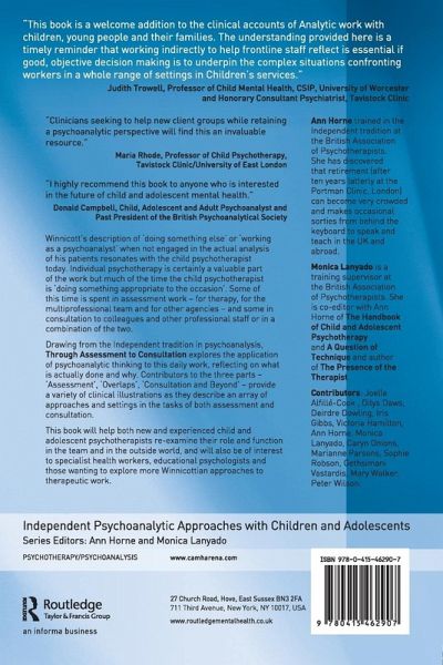 Winnicott's description of "doing something else" or "working as a psychoanalyst" when not engaged in the actual analysis of his patients resonates with the child psychotherapist today. Individual psychotherapy is certainly a valuable part of the work but much of the time the CPT is "doing something appropriate to the occasion". Some of this time is spent in assessment work - for therapy, for the multi-professional team and for other agencies - and some in consultation to colleagues and other professional staff or in a combination of the two. Drawing from the Independent tradition in psychoanalysis, Through Assessment to Consultation explores the application of psychoanalytic thinking to this daily work, reflecting on what is actually done and why. Contributors to the three sections - 'Assessment', 'Overlaps', 'Consultation and Beyond' - provide a variety of clinical illustrations as they describe a range of approaches and settings in the tasks of both assessment and consultation, ranging from the light impact of the analyst's presence in the grief of post-9/11 New York to the call to political potency of 'beyond consultation.' This book will help both new and experienced Child and Adolescent Psychotherapists re-examine their role and function in the team and in the outside world, and will also be of interest to specialist health workers, educational psychologists and those wanting to explore more Winnicottian approaches to therapeutic work.