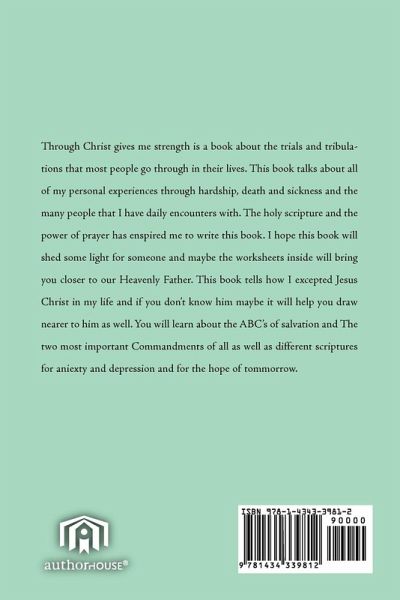 Through Christ gives me strength is a book about the trials and tribulations that most people go through in their lives. This book talks about all of my personal experiences through hardship, death and sickness and the many people that I have daily encounters with. The holy scripture and the power of prayer has enspired me to write this book. I hope this book will shed some light for someone and maybe the worksheets inside will bring you closer to our Heavenly Father. This book tells how I excepted Jesus Christ in my life and if you don't know him maybe it will help you draw nearer to him as well. You will learn about the ABC's of salvation and The two most important Commandments of all as well as different scriptures for aniexty and depression and for the hope of tommorrow.