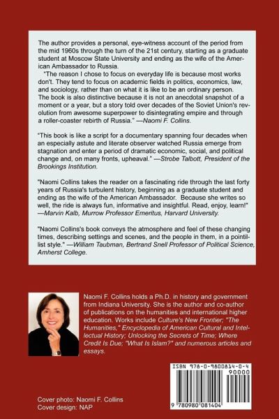 The author provides a personal, eye-witness account of the period from the mid 1960's through the turn of the 21st century, starting as a graduate student at Moscow State University and ending as the wife of the American Ambassador to Russia. This book is a set of reflections and impressions of an American woman living in Moscow for a number of years spread over four decades. It's about experiencing the place as a foreigner through living there daily, from life as a graduate student to life as the wife of the American Ambassador to Russia. "The reason I chose to focus on everyday life is because most works don't. They tend to focus on academic fields in politics, economics, law, and sociology, rather than on what it is like to be an ordinary person. The book is also distinctive because it is not an anecdotal snapshot of a moment or a year, but a story told over decades of the Soviet Union's evolution from awesome super power to disintegrating empire and through a roller-coaster rebirth of Russia." -Naomi Collins. "This book is like a script for a documentary spanning four decades when an especially astute and literate observer watched Russia emerge from stagnation and enter a period of dramatic economic, social, and political change and, on many fronts, upheaval." -Strobe Talbott, President of the Brookings Institution. "Naomi Collins takes the reader on a fascinating ride through the last forty years of Russia's turbulent history, beginning as a graduate student and ending as the wife of the American Ambassador. Because she writes so well, the ride is always fun, informative and insightful. Read, enjoy, learn!" -Marvin Kalb, Murrow Professor Emeritus, Harvard University. "Naomi Collins's book conveys the atmosphere and feel of these changing times, describing settings and scenes, and the people in them, in a pointillist style." -William Taubman, Bertrand Snell Professor of Political Science, Amherst College
