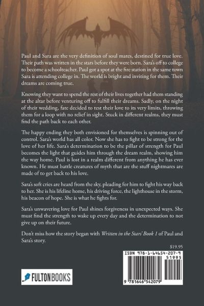 Paul and Sara are the very definition of soul mates, destined for true love. Their path was written in the stars before they were born. Sara's off to college to become a schoolteacher. Paul got a spot at the fire station in the same town Sara is attending college in. The world is bright and inviting for them. Their dreams are coming true. Knowing they want to spend the rest of their lives together had them standing at the altar before venturing off to fulfill their dreams. Sadly, on the night of their wedding, fate decided to test their love to its very limits, throwing them for a loop with no relief in sight. Stuck in different realms, they must find the path back to each other. The happy ending they both envisioned for themselves is spinning out of control. Sara's world has all color. Now she has to fight to be strong for the love of her life. Sara's determination to be the pillar of strength for Paul becomes the light that guides him through the dream realm, showing him the way home. Paul is lost in a realm different from anything he has ever known. He must battle creatures of myth that are the stuff nightmares are made of to get back to his love. Sara's soft cries are heard from the sky, pleading for him to fight his way back to her. She is his lifeline home, his driving force, the lighthouse in the storm, his beacon of hope. She is what he fights for. Sara's unwavering love for Paul shines forgiveness in unexpected ways. She must find the strength to wake up every day and the determination to not give up on their future. Don't miss how the story began with Written in the Stars' Book 1 of Paul and Sara's story.