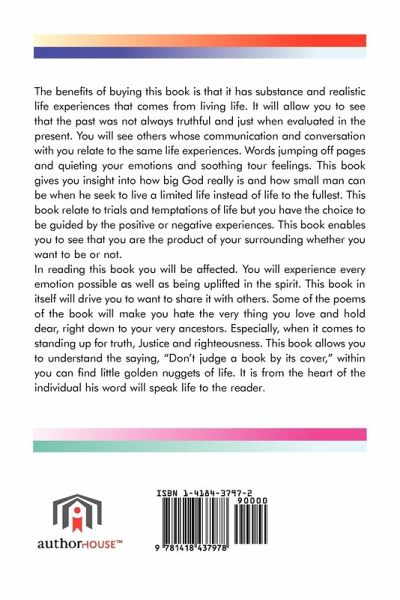 The benefits of buying this book is that it has substance and realistic life experiences that comes from living life. It will allow you to see that the past was not always truthful and just when evaluated in the present. You will see others whose communication and conversation with you relate to the same life experiences. Words jumping off pages and quieting your emotions and soothing tour feelings. This book gives you insight into how big God really is and how small man can be when he seek to live a limited life instead of life to the fullest. This book relate to trials and temptations of life but you have the choice to be guided by the positive or negative experiences. This book enables you to see that you are the product of your surrounding whether you want to be or not. In reading this book you will be affected. You will experience every emotion possible as well as being uplifted in the spirit. This book in itself will drive you to want to share it with others. Some of the poems of the book will make you hate the very thing you love and hold dear, right down to your very ancestors. Especially, when it comes to standing up for truth, Justice and righteousness. This book allows you to understand the saying, "Don't judge a book by its cover," within you can find little golden nuggets of life. It is from the heart of the individual his word will speak life to the reader.
