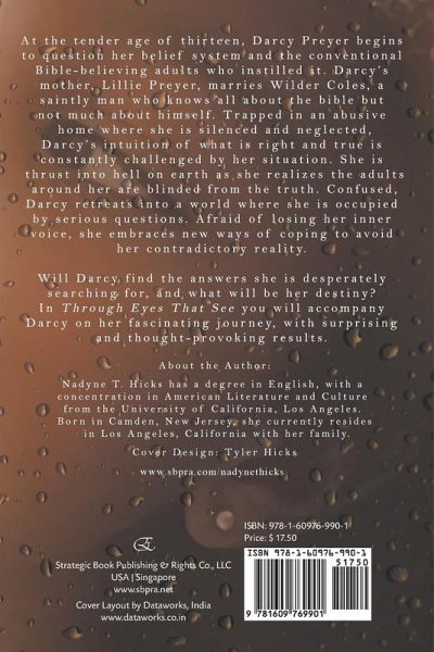 At the tender age of thirteen, Darcy Preyer begins to question her belief system and the conventional Bible - believing adults who instilled it. Darcy's mother, Lillie Preyer, marries Wilder Coles, a saintly man who knows all about the bible but not much about himself. Trapped in an abusive home where she is silenced and neglected, Darcy's intuition of what is right and true is constantly challenged by her situation. She is thrust into hell on earth as she realizes the adults around her are blinded from the truth. Confused, Darcy retreats into a world where she is occupied by serious questions. Afraid of losing her inner voice, she embraces new ways of coping to avoid her contradictory reality. Will Darcy find the answers she is desperately searching for, and what will be her destiny? In Through Eyes That See you will accompany Darcy on her fascinating journey, with surprising and thought-provoking results. About the Author: Nadyne T. Hicks has a degree in English, with a concentration in American Literature and Culture from the University of California, Los Angeles. Born in Camden, New Jersey, she currently resides in Los Angeles, California with her family.